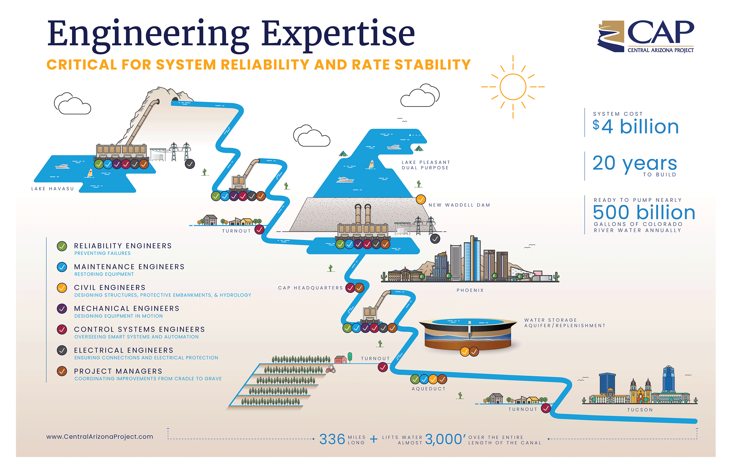 The 336-mile CAP system is an engineering marvel, that includes pumping plants, siphons, check structures, Lake Pleasant, and more! Its features are as diverse as the engineers who built the system and those who continue to lend their expertise to ensuring its reliability today.
